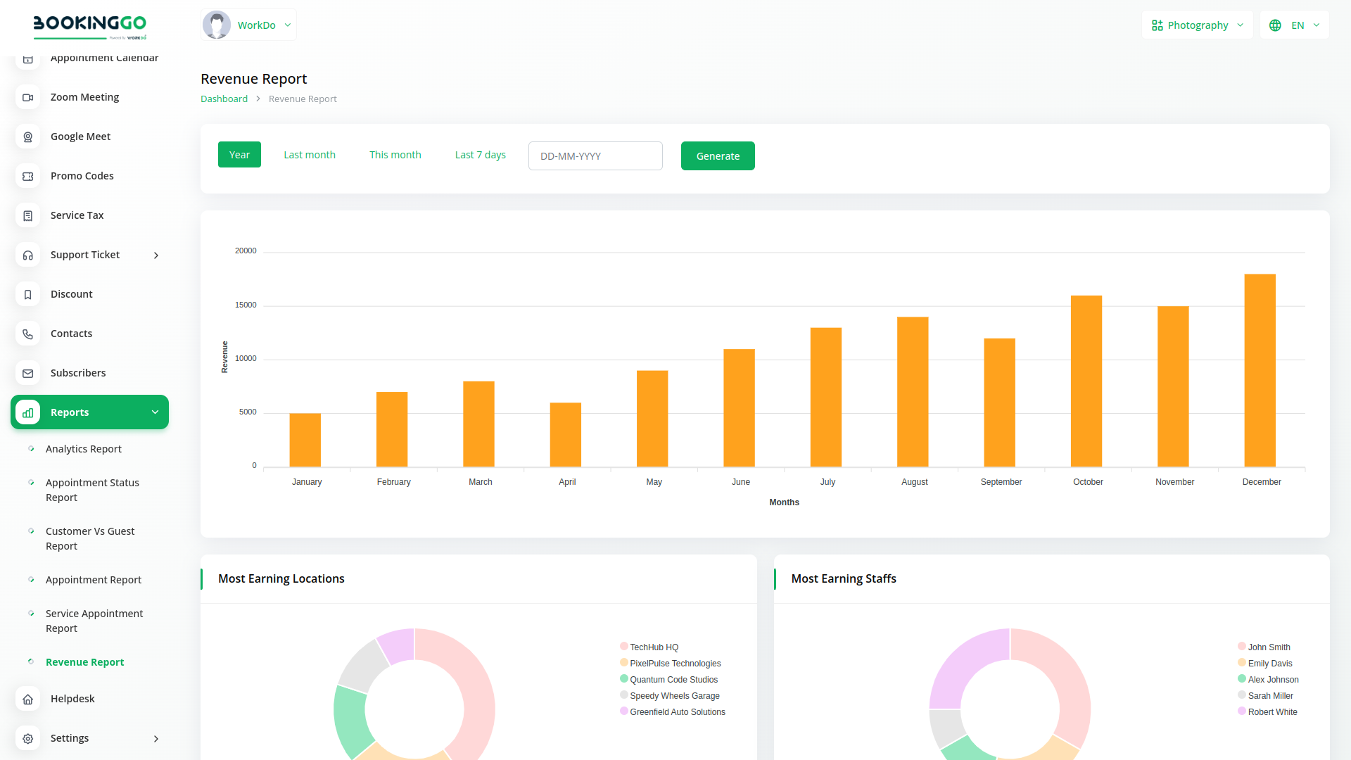 The Reports module in BookingGo SaaS is designed to provide comprehensive insights into your business operations, specifically focusing on key metrics and performance indicators. This module allows you to generate detailed reports that help you monitor and analyze various aspects of your service appointments and customer interactions. With its intuitive interface and powerful reporting capabilities, the Reports module empowers you to make data-driven decisions and optimize your business effectively.