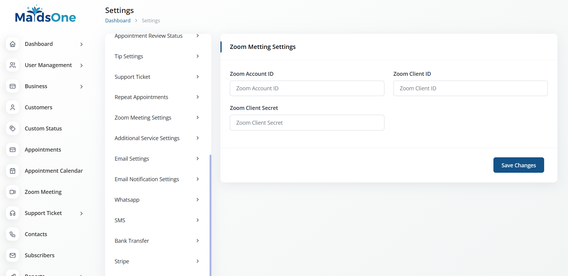 Introducing Zoom Meeting Integration for Maidsone ! This feature seamlessly integrates Zoom powerful video conferencing capabilities into the Maidsone platform, offering users a comprehensive solution for meeting management. With Zoom Meeting Integration, users can schedule, host, and join Zoom meetings directly from their Maidsone account, streamlining the entire meeting process.